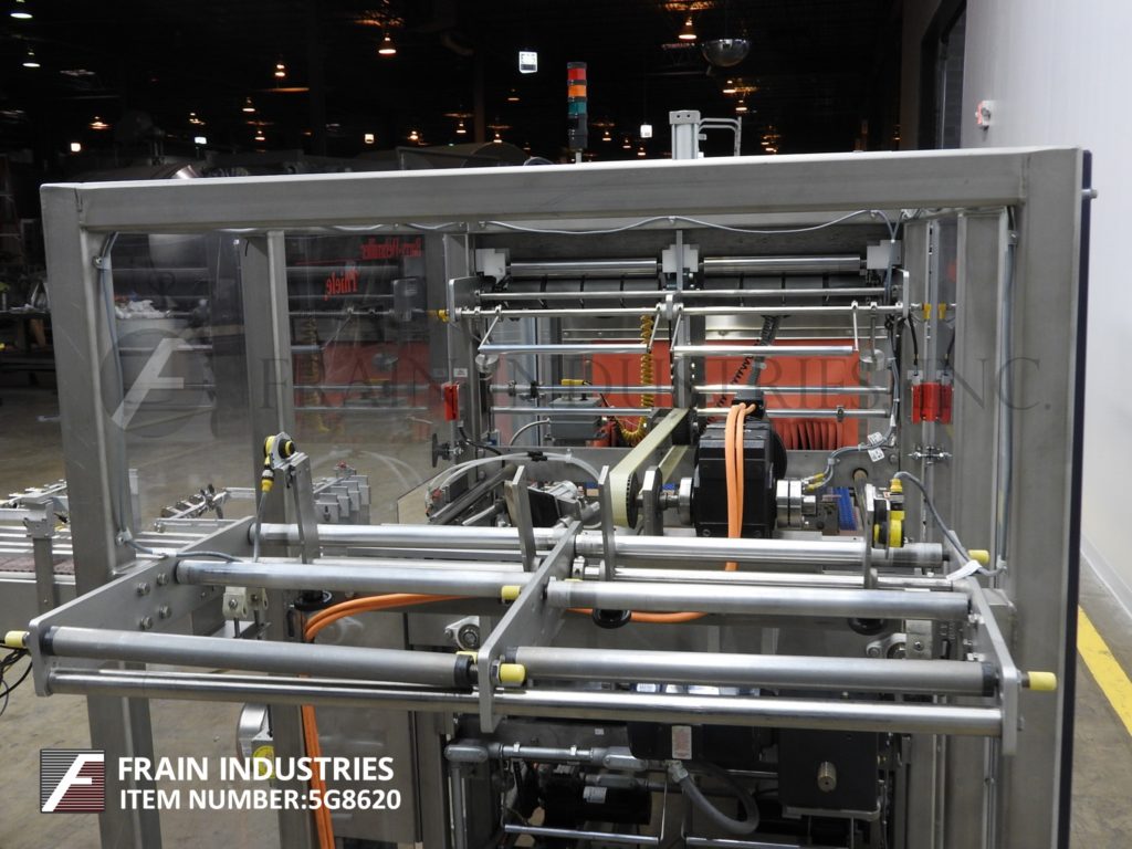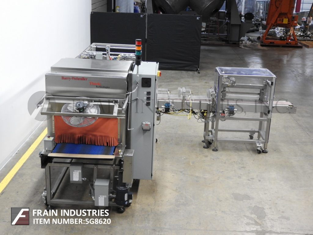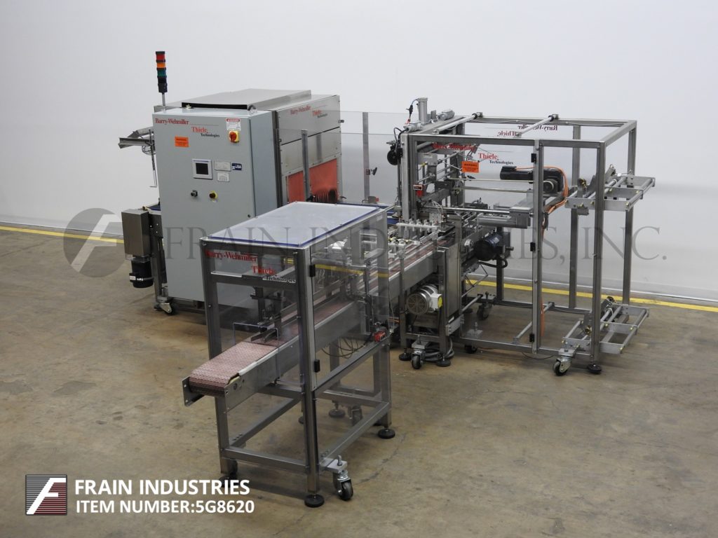 Back to All EquipmentThiele, shrink bundling system with right angle laner infeed. Rated from 10 to 30 bundles per minute – depending on materials, application pack pattern and machine configuration. Maximum product height: 6¼"; maximum film width: (2) 13" rolls. Equipped with a 9" wide x 115" long 1 to 3 lane 90° infeed, (2) pusher plate feeders, 27" wide seal bar, product hold down clamp, stainless steel shrink tunnel with 32" wide x 15" high aperture and 48" long chamber with 30" wide x 94" long thru belt conveyor and 36" discharge height. All stainless steel frame and enclosure with lexan doors and machine leveling pads and casters. Fully automated with AB PLC rack and AB PanelView Plus 600 touch screen display, digital temp controllers for heat tunnel and seal bars with statis light bar. Mounted on base frame with leveling legs.