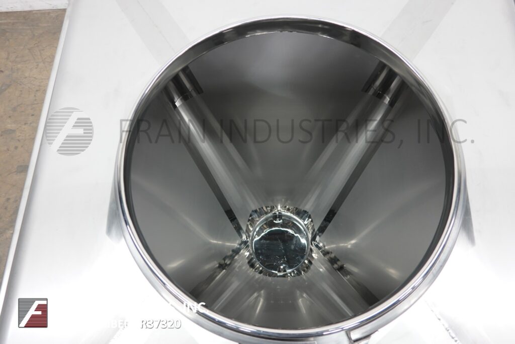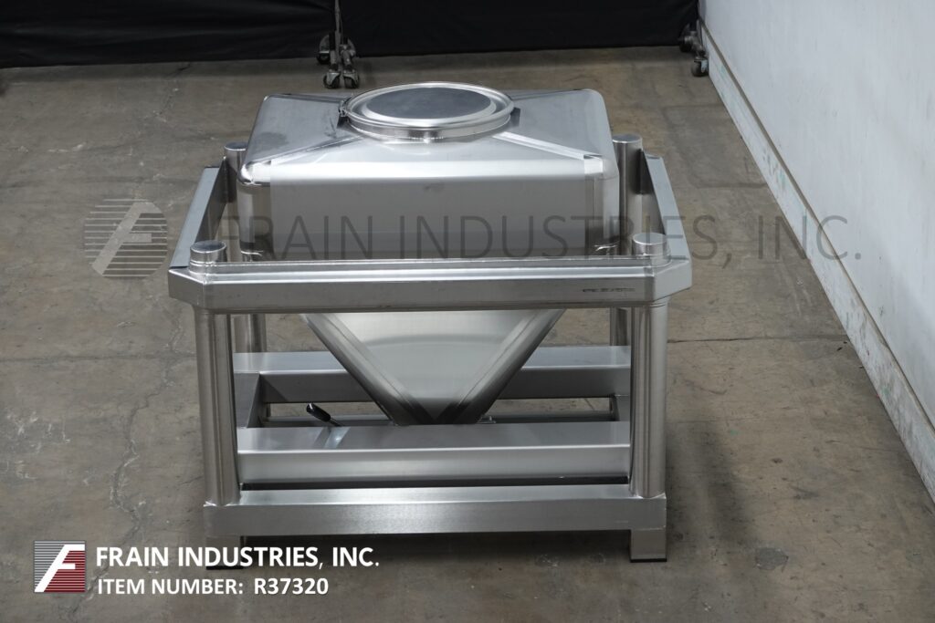 Back to All EquipmentTote Systems, 316 stainless steel, 500 liter capacity tote / bin. Equipped with a 32" wide x 40" long x 40" deep vessel, 8" straight wall, 18" diameter manway with clamp down cover, 10" diameter discharge with butterfly valve and 7" ground clearance. Mounted on heavy duty stainless steel forklift base.