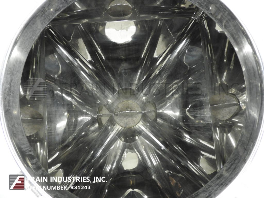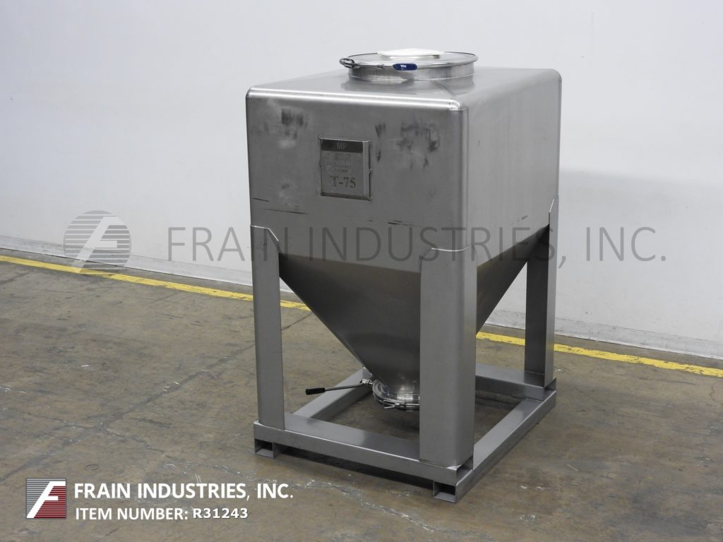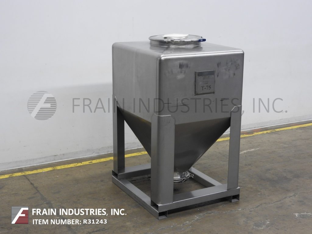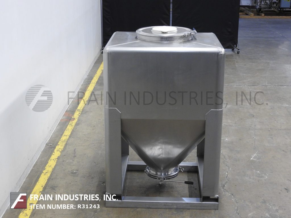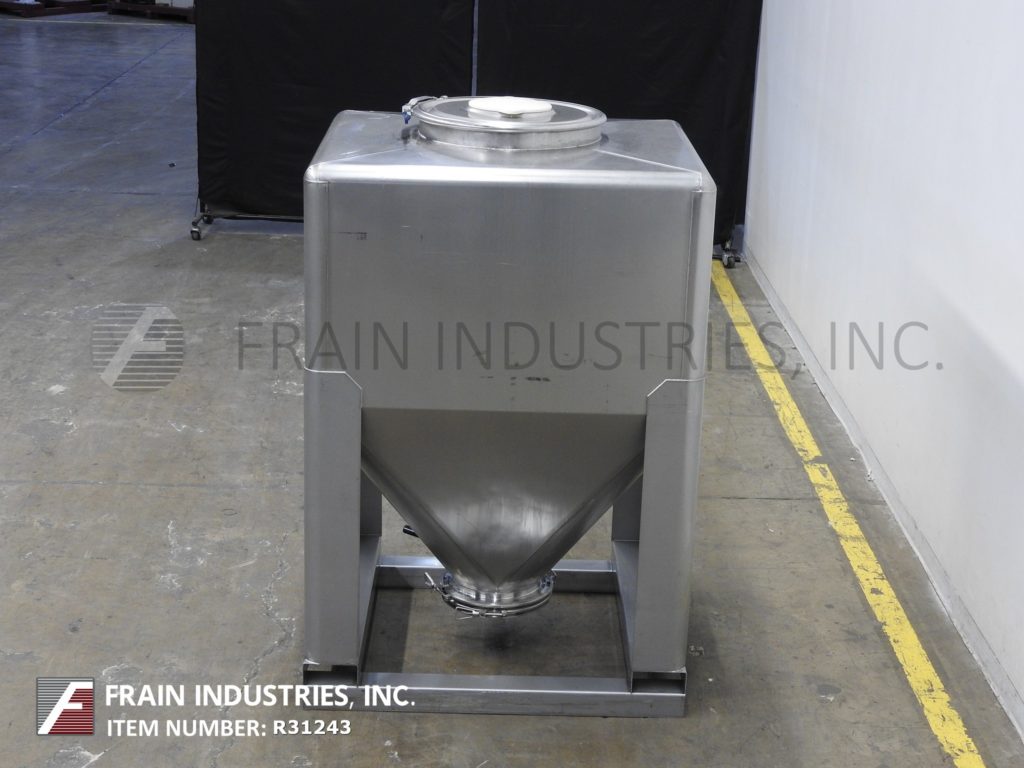 Back to All EquipmentTote Systems, 316 stainless steel, 1400 liter capacity tote / bin. Equipped with a 48" wide x 48" long x 60" deep vessel, 24" diameter manway with clamp down cover and 10" diameter discharge with butterfly valve. Mounted on heavy duty stainless steel forklift base.