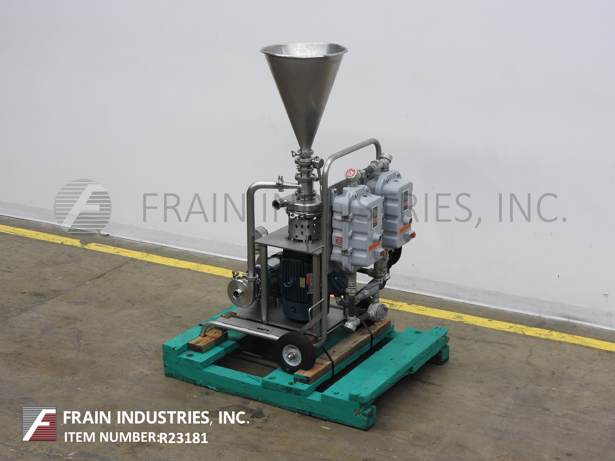 Back to All Equipment316 S/S tri-blender capable of processing up to 45 gallons of liquid per minute and dispensing powder at 50 lbs per minute (absorption dependent on model and product characteristics). Has 10 gallon 304 S/S hopper, liquid supply pump, 1 1/2" diameter triclover supply pump inlet, 1 1/2" diameter triclover tri-blender outlet, and independent push button controls for tri-blender and liquid supply pump. Mounted on stainless steel dolly with 8" diameter solid rubber wheels.