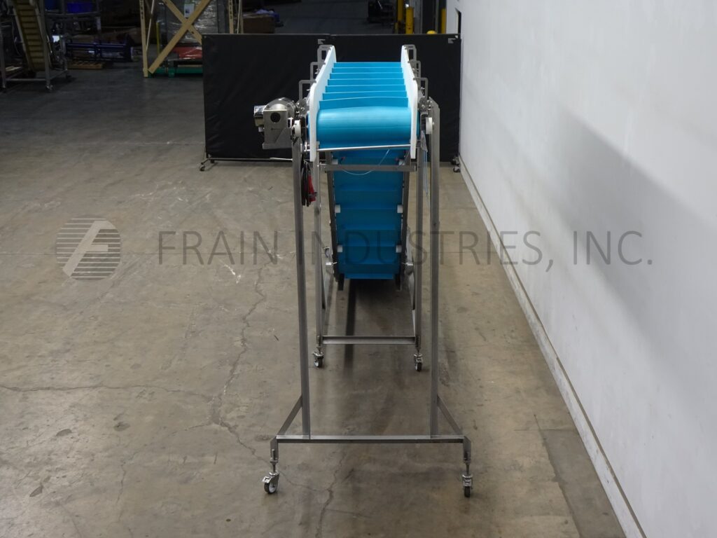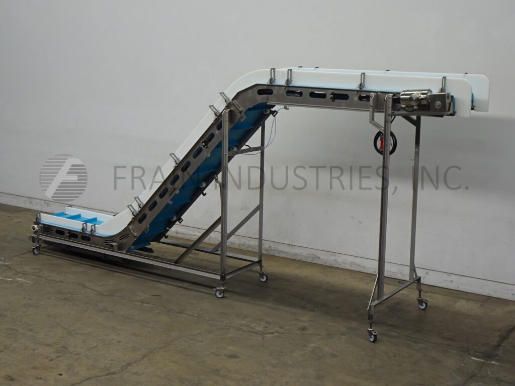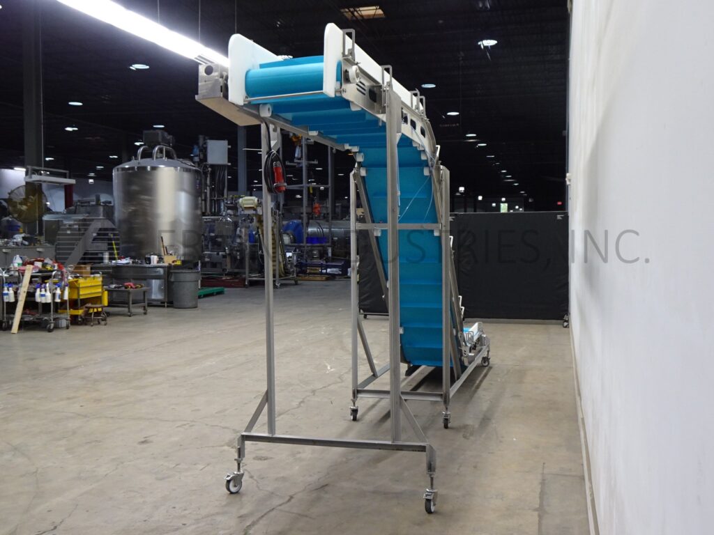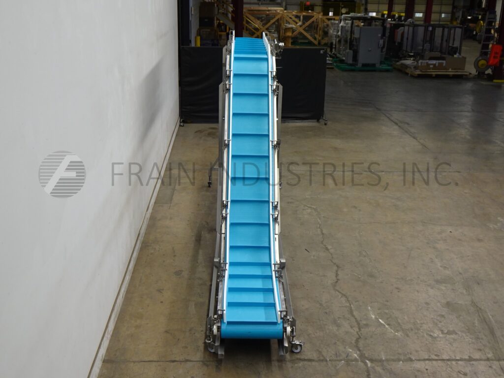 Back to All EquipmentTri-Mach, stainless steel inclined cleated conveyor with number of product per hour – depending on materials and application. Equipped with 22" wide x 254" long belt with 18" wide x 2" high cleats set on 12" centers. 54" long horizontal run with16" in feed height, 112" long incline section and 88" long top horizontal section with 96" discharge height.