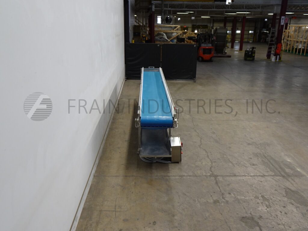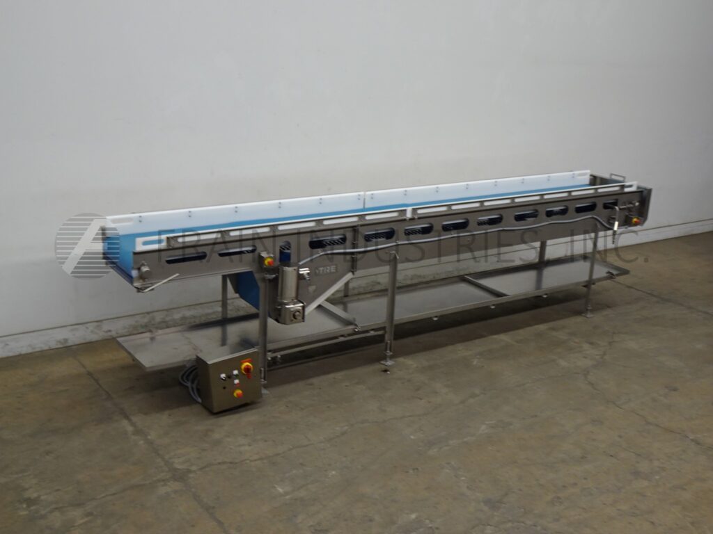 Back to All EquipmentTwo Rivers Enterprise conveyor. Equipped with 110" long x 24" wide belt with 45" infeed/discharge height, 6" high UHMW product containment walls. Mounted on stainless steel frame.