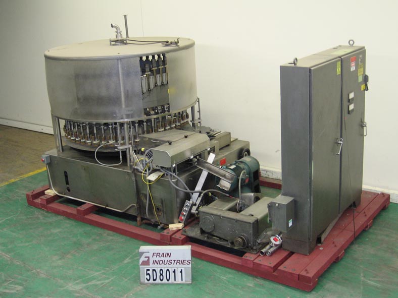 48 Valve rotary, 316 S/S, gravity pressure filler rated 80 to 420 cpm – depending on materials and application. Container size range: 1" to 4" in Diameter; 4-1/2" to 12" in Height. Equipped with 3/8" OD nozzles on 4 1/4" centers, worm screw to star wheel in-feed, star wheel discharge, centering bells, no container/no fill, and centrifugal pump for overflow return. Mounted on a S/S base.