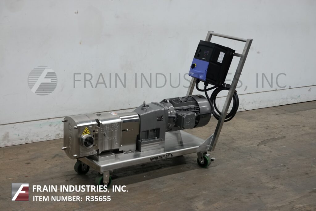Back to All EquipmentUnibloc, Model PD550, Positive displacement pump with 316 stainless steel contact parts. Rated from 20 to 225 gallons of product per minute – depending on materials, application and machine configuration. 500 psi maximum working pressure, temperature range of 400° F and capable operating both clockwise, or counter clockwise. Equipped with a 3½" OD / 3" ID Tri-clamp style product charge / discharge with 12" ground clearance and variable speed controller. Powered by a 7½ Hp drive with a 4.43:1 gear ratio for a current maximum rate of 113.8 gallons / minute. Mounted on a 40" long x 16" wide stainless steel cart with casters.