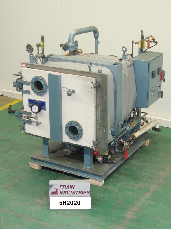 Back to All EquipmentUnited McGill Model 6D8, batch, vacuum shelf dryer, has 92.6 square feet of shelf area with number of product per hour – depending on materials, application and machine configuration. 304 stainless steel contact parts and carbon steel external parts. Chamber dimensions of: 40-1/2" in Width; 49" in Depth; 35" in Height and has (9) stainless steel internally heated 39-1/4" wide x 42-1/2" long product shelves with 2-1/2" gaps and swing open, bolt down access door with (2) 6" OD sight ports. Liquid ring vacuum pump, vacuum gauge and vacuum release valve with a water system that will maintain tray temperatures at any desired setpoint between the temperature of the cold water supply and 100 Deg C. Capable of absolute pressure down to 0.23 psi and 0.47" Hg this is equivalent of 29.45" Hg vacuum depending on barometric pressure. Control panel has vacuum and circulation pump start / stop push buttons and temperature and vacuum touch pad controls with digital display. Mounted on 96" long x 60" wide forkable steel platform.