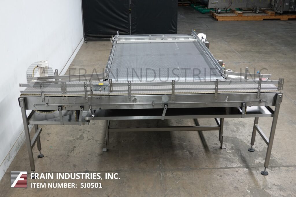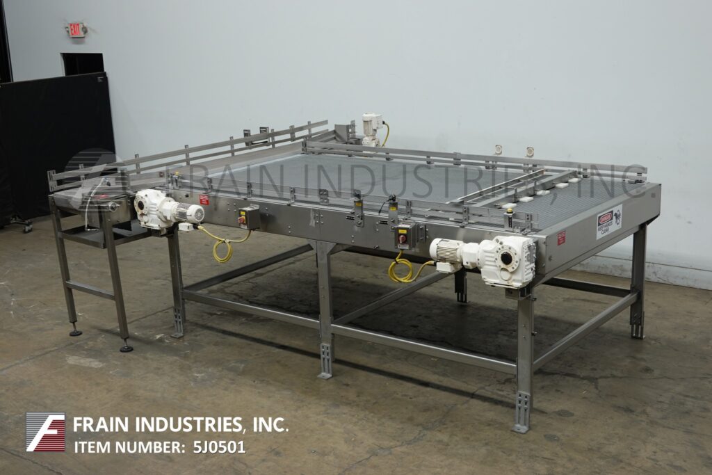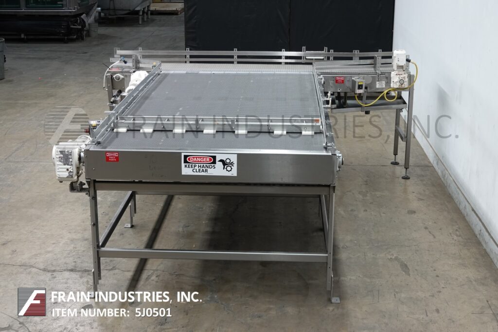Back to All Equipment72" wide x 134" long, stainless steel accumulation table with number of containers per minute / hour – depending on materials and application. Equipped with 7-1/2" wide infeed conveyor, 15" wide x 144" long transfer conveyor and 72" wide x 134" long accumulation section with adjustable guide rails and 50" to 54" in feed and discharge height.