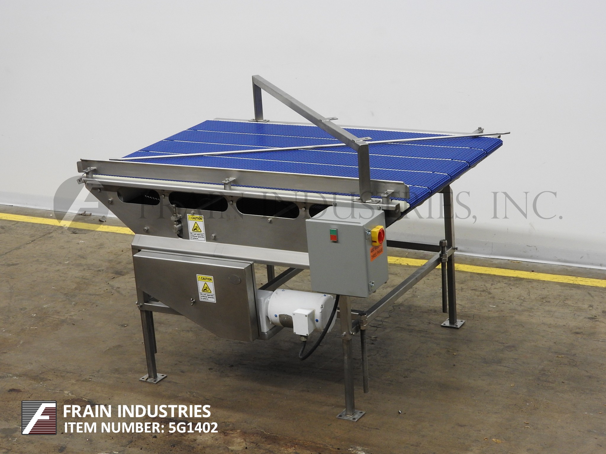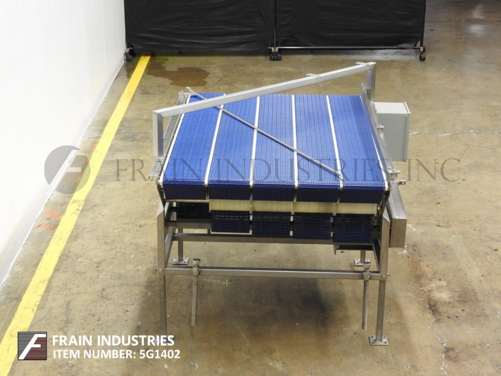 Back to All EquipmentStainless Steel 5 lane accumulation table 68" (L) x 42" (W). Equipped with a 1 1/4" (H) adjustable product arm, 3 1/2" (H) guide rails. Unit mounted on a stainless steel frame and was last used in a tray filling line. Each lane running faster then the next.