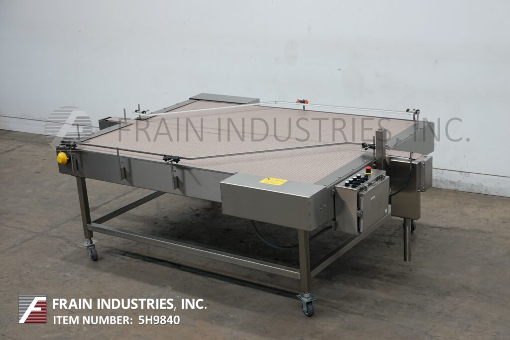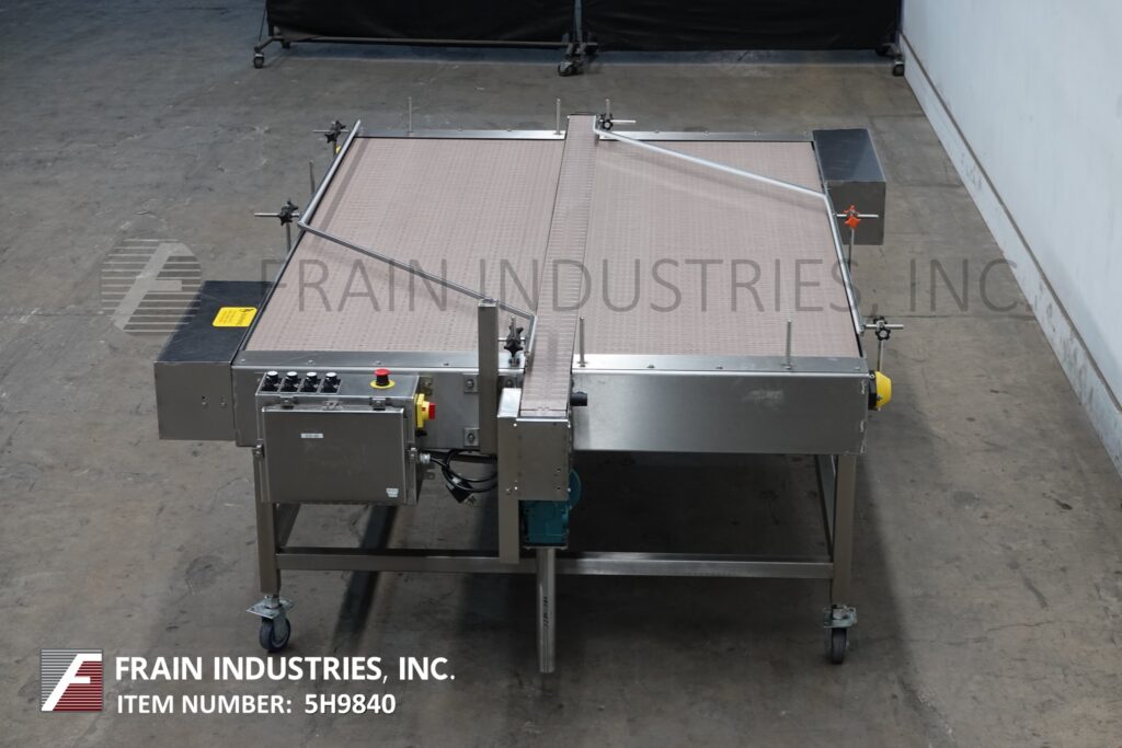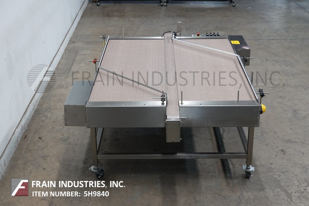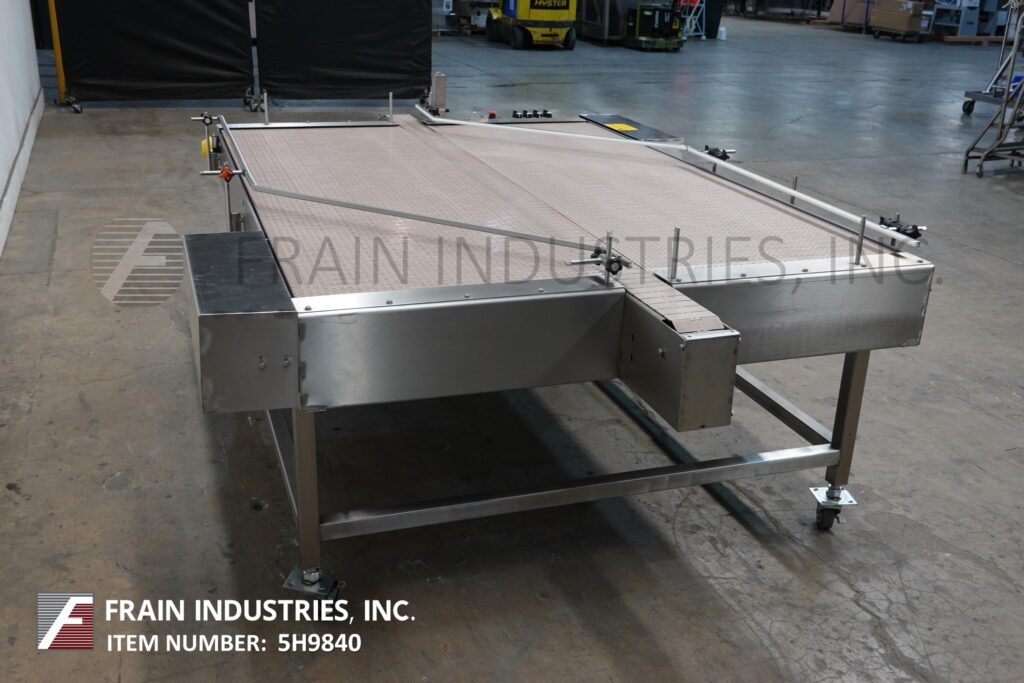 Back to All EquipmentStainless steel, table top belt accumulation conveyor. Equipped with 4½" wide x 115" long Delrin product feed conveyor and (2) 30" wide x 87" long bi-directional accumulating belts which feed into the product conveyor. Mounted on a stainless steel base frame with height adjustable legs and casters with an infeed / discharge range of 37" to 42". Control panel with variable speed dials for each belt.