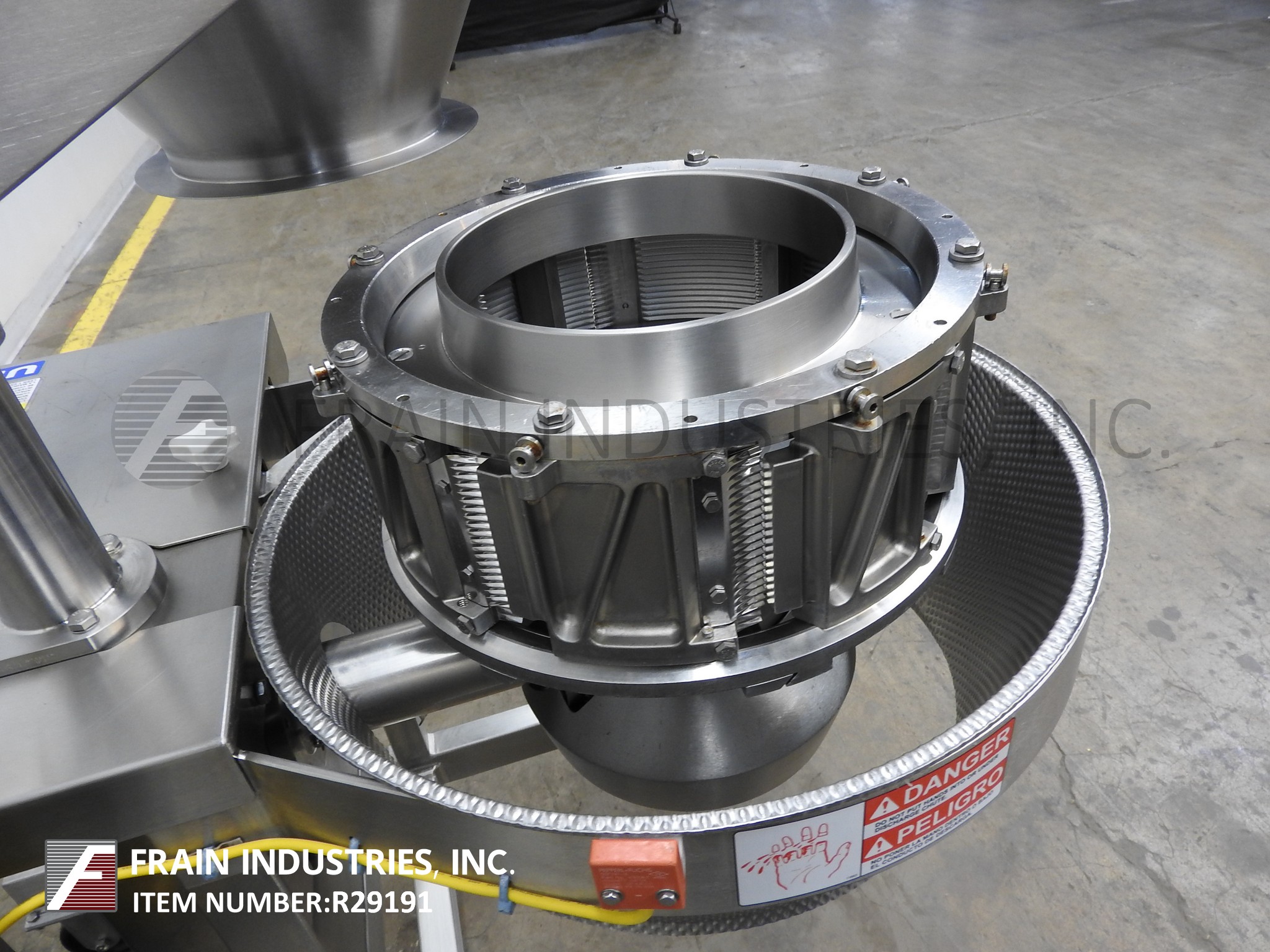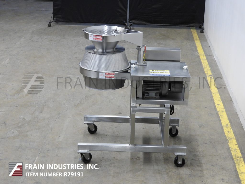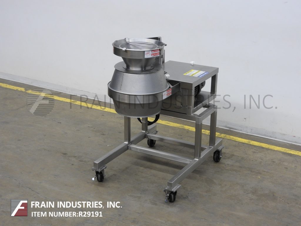 Back to All EquipmentUrschel, Model CC, slices, strip cuts, shreds and crinkle cuts a variety of food products at high speed production rates with volumes per hour – depending on materials, application and machine configuration. Flat Slices: 0.8mm to 12.7mm, Standard Crinkle: 3-1/3 to 5.7 waves per inch Depth of Crinkle: 2.0mm to 2.1mm, Thickness: .040mm to .285mm, V-Slices 4.7 to 8 waves per inch Depth of Crinkle: (4.7) 2.1mm, Thickness: 1.0mm to 2.5mm. Depth of Crinkle (8)1.3mm, Thickness: 1.0mm to 2.5mm. Also does Oval, Cresent Shreds and strip cuts. Centrifical type slicer utilizes rotating impeller that forces the product to the side walls and thru (8) individual interchangeable cutting heads that enable the processor to change the type of cut in minutes, with specially designed throw away knives inexpensive to replace. Accept products up to 3¾" in any dimension. Equipped with stainless steel feed hopper, discharge chute, start / stop buttons controls and is mounted on stainless steel base frame. Change parts required to accomodate application range.