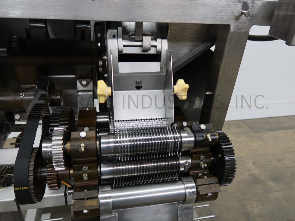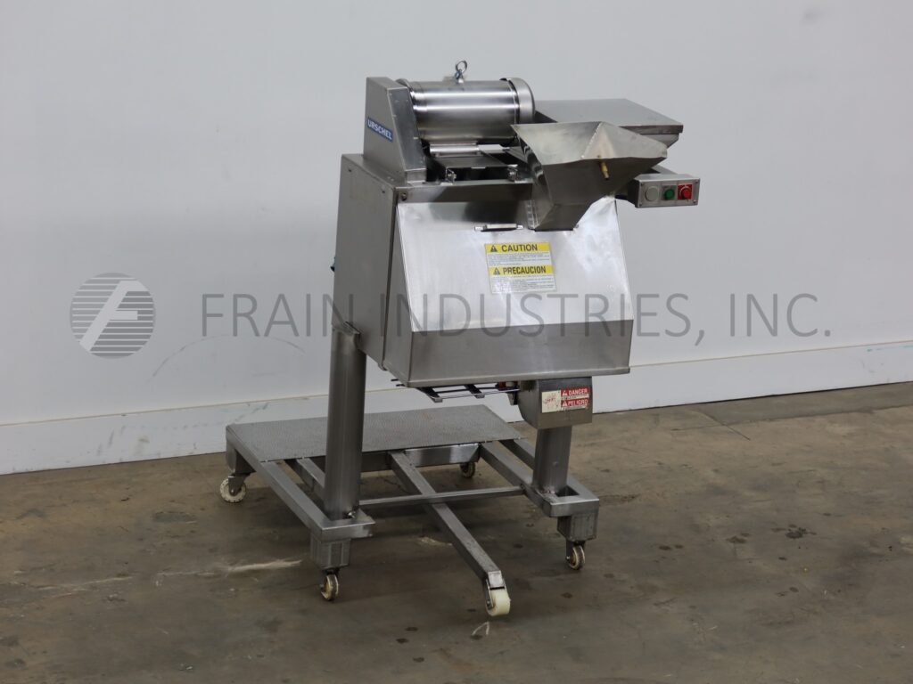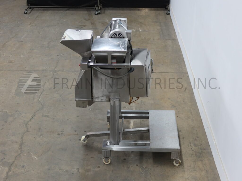 Back to All EquipmentUrschel, Model RAA, Stainless steel USDA approved cutter. Capable of slices, dices, and strip cuts at speeds from 2500 to 5000 lbs. per hour. Equipped with 14" x 15" product infeed and 7" wide product discharge with 26" discharge height. Unit is capable of cutting up to a 3½" diameter log of product. Unit consists of slicing knife capable of 1/16" to 3/8" cuts, circular knife capable of 1/8" to 1" cuts, and crosscut knives capable of 1/16" to 1½" cuts. To cut different size pieces change parts are needed per application. Slicing also requires a change part. Unit mounted on stainless steel base. Last running in a bread operation. Change parts required to accommodate size range.