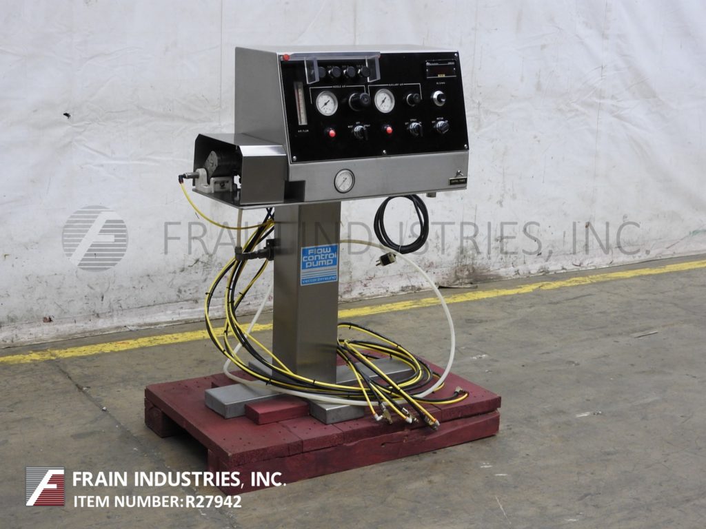 Back to All EquipmentVector Type "FLOW-CONTROL" self contained recirculation type multiple gear pump unit with flow rate accuracies of (+/-) 1%. The (4) pump unit has (4) spray gun control capabilities with mist spray/ spray, nozzle/auxiliary air and motor/power on/off controls with a Red Line Control Model "DITAK IID" digital readout for ml’s/mins. Gear pumps can be easily remove for cleaning, and can be run independent of Vector coating machine. Mounted on "T-BASE" type stand with casters for mobility. Last running in a pharmaceutical operation. (OAD:14"L x 34"W x 47"H).