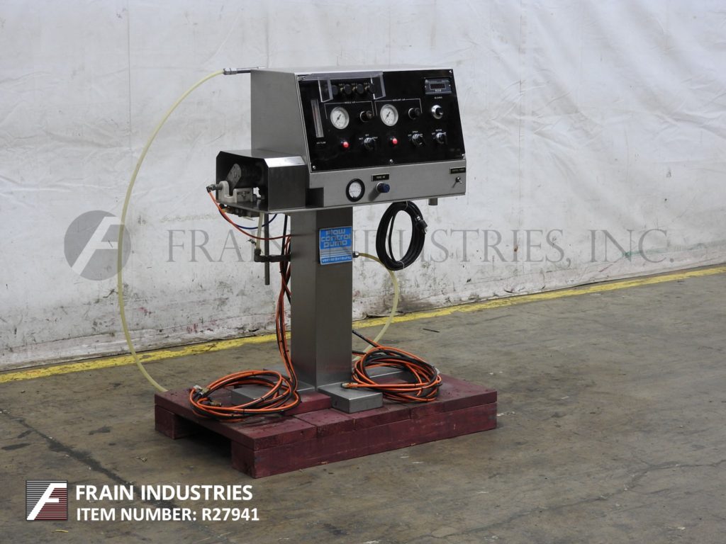 Back to All EquipmentVector Type "FLOW-CONTROL" self contained recirculation type multiple gear pump unit with flow rate accuracies of (+/-) 1%. The (4) pump unit has (4) spray gun control capabilities with mist spray/ spray, nozzle/auxiliary air and motor/power on/off controls with a Red Line Control Model "DITAK IID" digital readout for ml’s/mins. Gear pumps can be easily remove for cleaning, and can be run independent of Vector coating machine. Mounted on "T-BASE" type stand with casters for mobility. Last running in a pharmaceutical operation. (OAD:14"L x 34"W x 47"H).