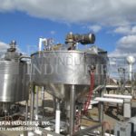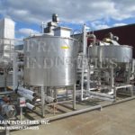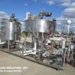 Back to All EquipmentComplete stainless steel, melting and mixing system with amount of product per hour – depending on materials and application. Includes (1) Chester Jensen, 367 gallon, stainless steel cone bottom jacketed cooker / cooler with 74" ID x 21-1/2" straight wall x 19-1/2" cone bottom. Bridge mounted dual motion scrape surface agitation, counter rotating high speed tri-blade agitator and curved stationary baffle. (1) 2 Hp and (1) 3 Hp, motor drives with gear reducer and (2) 2" inlet ports with 2-piece flip-up covers and proximity sensors. Bottom dimpled jacket rated at MAWP 100psi @ 340°F and MDMT -20°F @ 100psi. with (2) bottom 2" npt jacket in / outlet ports. (1) Walker 500 gallon 304 stainless steel full jacketed cone bottom tank. 57"I.D. x 49-1/2" high staight wall, Bridge mounted dual motion scrape surface agitation (1) 2 Hp and (1) 3 Hp motor drives with gear reducer, (4) 3" tri-clamp inlet ports and 2-piece flip-up cover with proximity sensors. Full multi zone jacket rated at MAWP 100psi @ 350°F and MDMT -20°F @ 100psi, with 4-side and 2-bottom 1-1/2" jacket inlet / outlet ports and bottom mounted temperature probe (1) Fristam 10 Hp centrifugal pump with 2-1/2" x 2" in/outlet tri-clamp ports, (1) Rotan 5 Hp and (1) Rotan 1.5 Hp 3" flanged port pumps. (1) Bunting 3" stainless steel in line magnetic trap (1) Sani-Matic stainless steel streamline filter. 316L stainless steel hygienic jacketed piping as well as all associated valves and fittings. Mounted on 246" long x 62-1/2" wide x 7" high stainless steel base frame and 207" long x 132" wide x 42" high side railing, inspection platform with control panel.