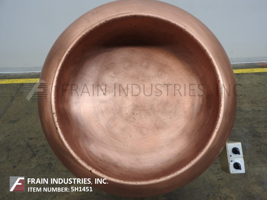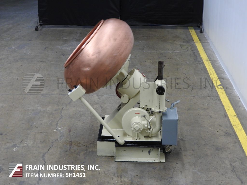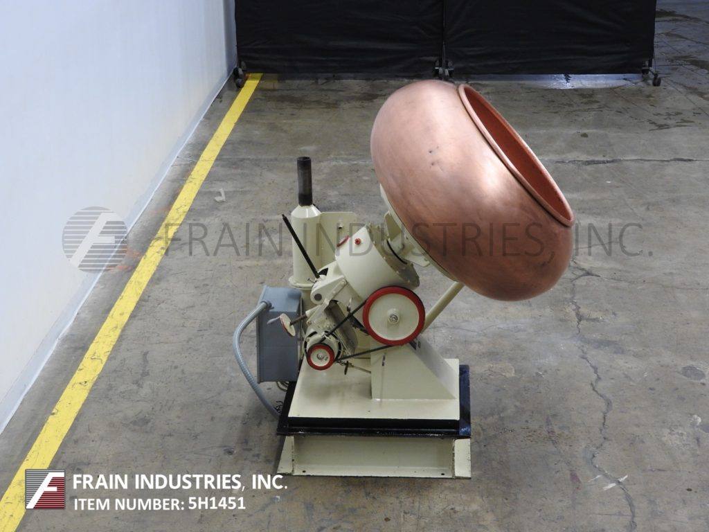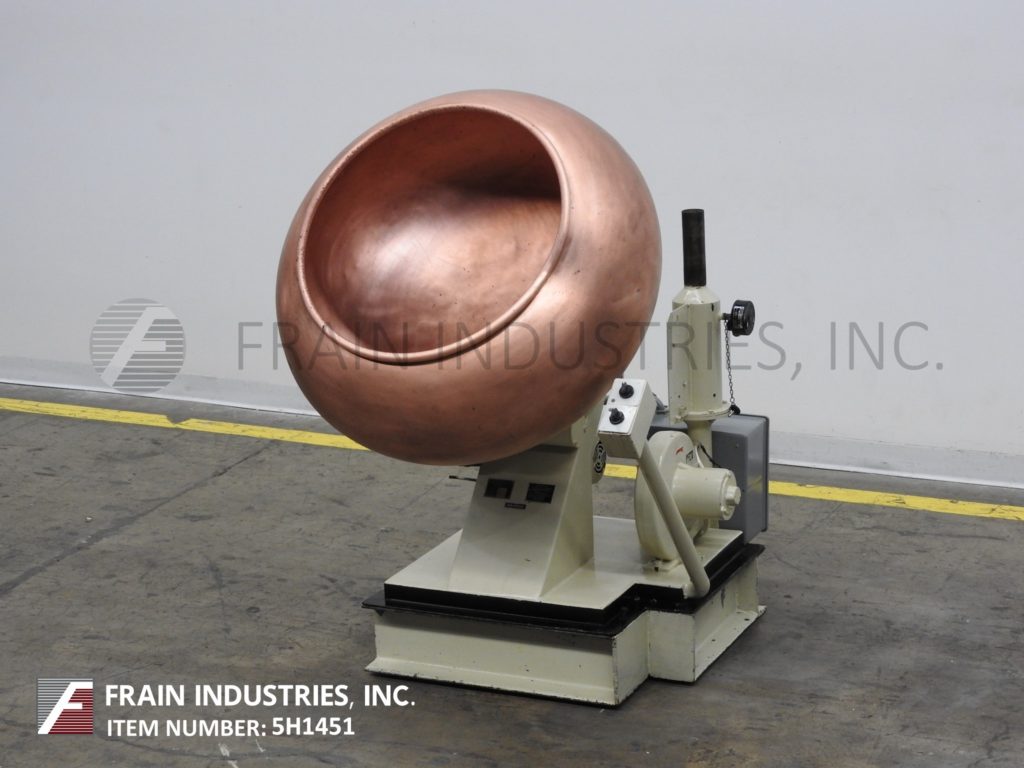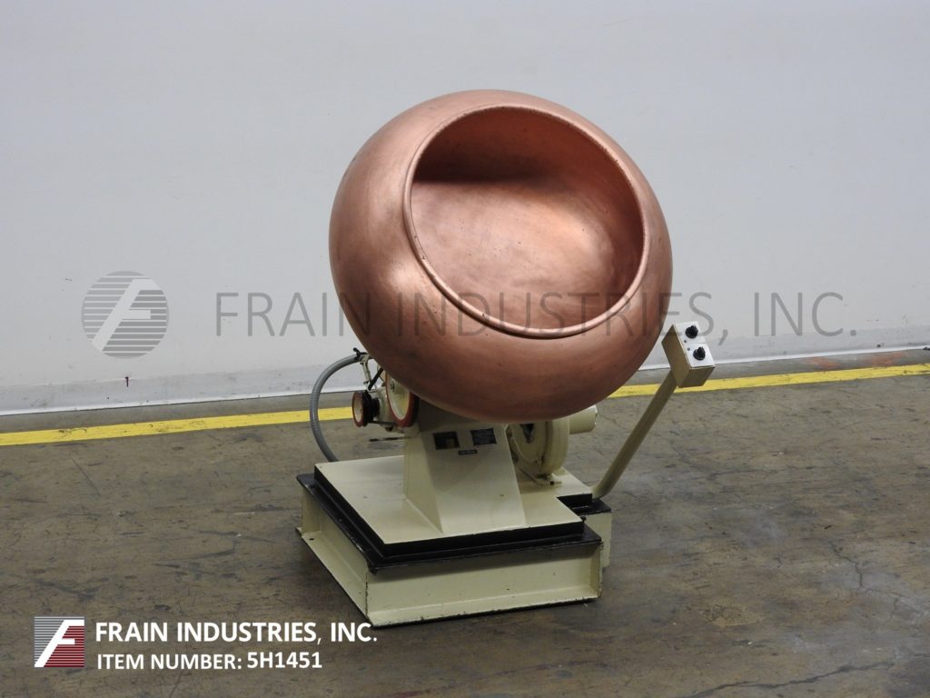 Back to All EquipmentWalter Brucks, Model 11G, 38" copper, doughnut shaped, coating pan. Pounds of product per hour – depending on materials, application and operator dexterity. Equipped with a 38" diameter x 19" deep coating bowl, 25" diameter product access port with 38" ground clearance and a Hot air blower. Mounted on painted base frame with start / stop switch controls.