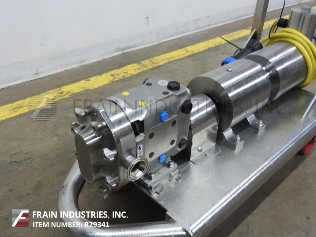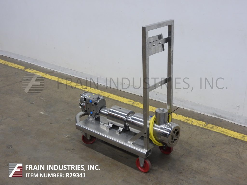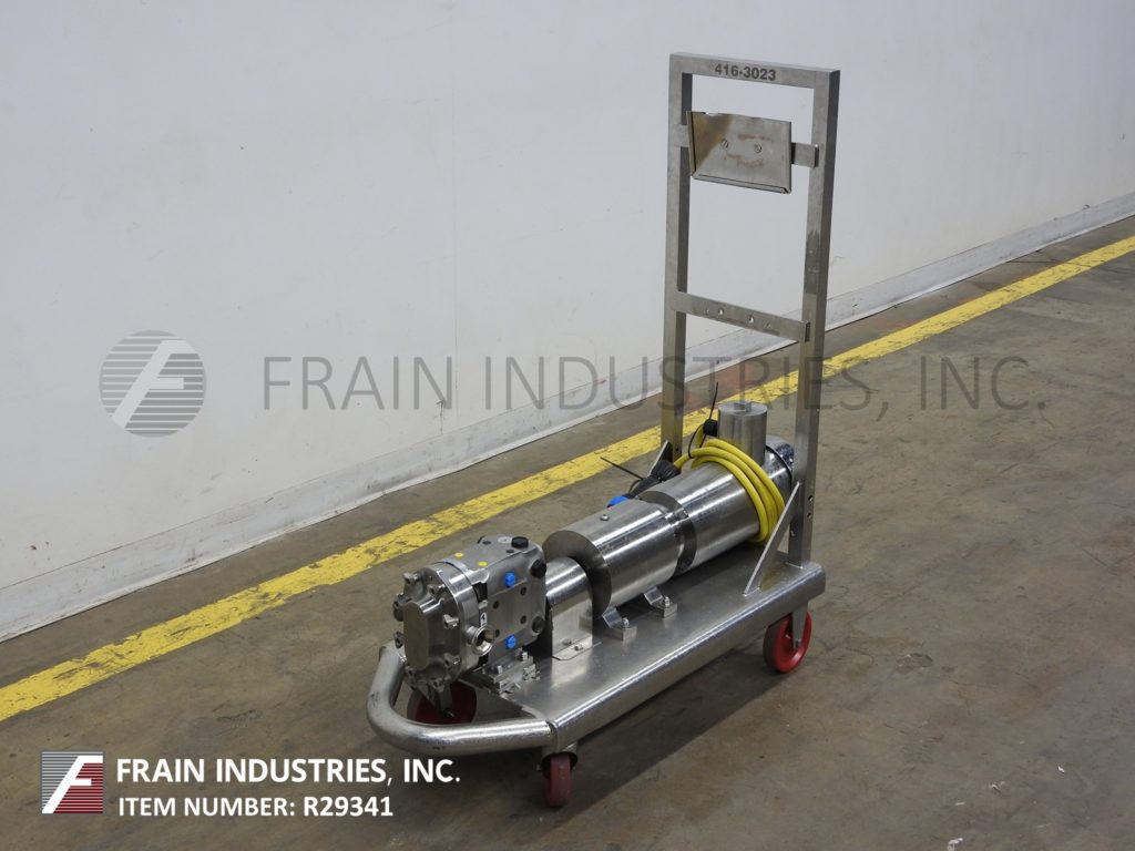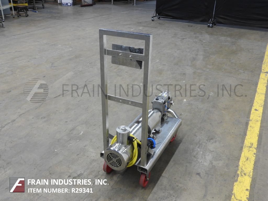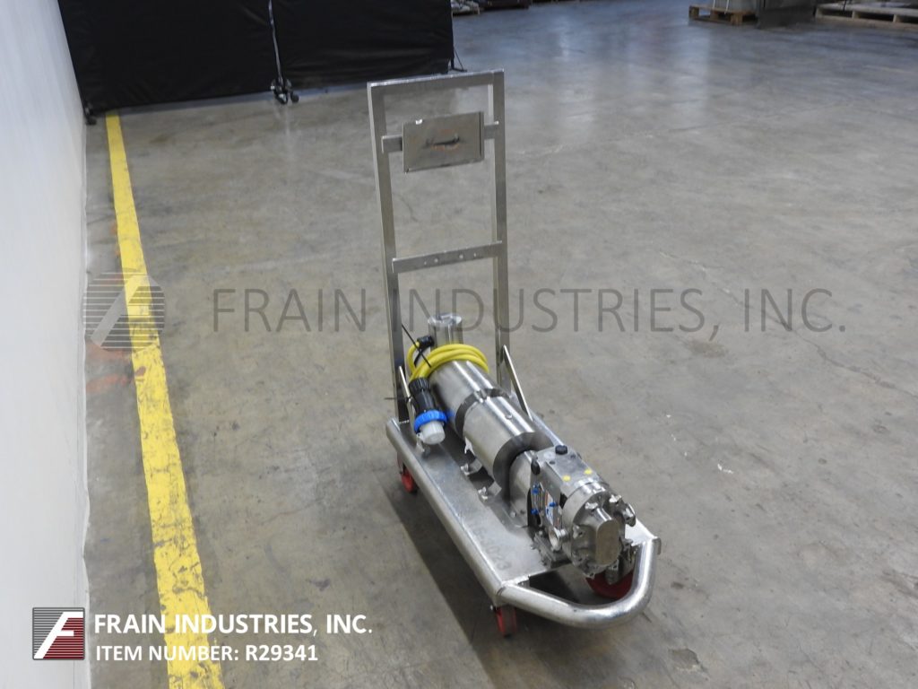 Back to All EquipmentWaukesha, Model 15, positive displacement pump with 316 stainless steel contact parts. Rated from 1 to 10 gallons of product per minute – depending on materials, application and machine configuration. 200 psi maximum working pressure, temperature range of -40 Deg F to 200 deg f standard and up to 300 deg F with hot clearence rotors / stators and viton seals and capable operating both clockwise, or counter clockwise. Equipped with a 2" OD / 1½" ID Tri-clamp style product charge / discharge with 11" ground clearance. Powered by a 2 Hp drive with a variable speed controller and a 3:1 gear ratio for a maximum current rate of 7.5 gal/min. Mounted on a 45" long x 18" wide stainless steel push cart.