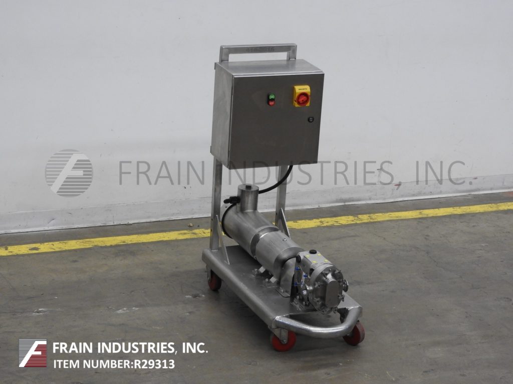 Back to All EquipmentWaukesha, Model 15, positive displacement pump with 316 stainless steel contact parts. Rated from 1 to 10 gallons of product per minute – depending on materials, application and machine configuration. 200 psi maximum working pressure, temperature range of -40 Deg F to 200 deg f standard and up to 300 deg F with hot clearence rotors / stators and viton seals and capable operating both clockwise, or counter clockwise. Equipped with a 2" OD / 1½" ID Tri-clamp style product charge / discharge with 11" ground clearance. Powered by a 2 Hp drive with a variable speed controller and a 3:1 gear ratio for a maximum current rate of 7.5 gal/min. Mounted on a 45" long x 18" wide stainless steel push cart.