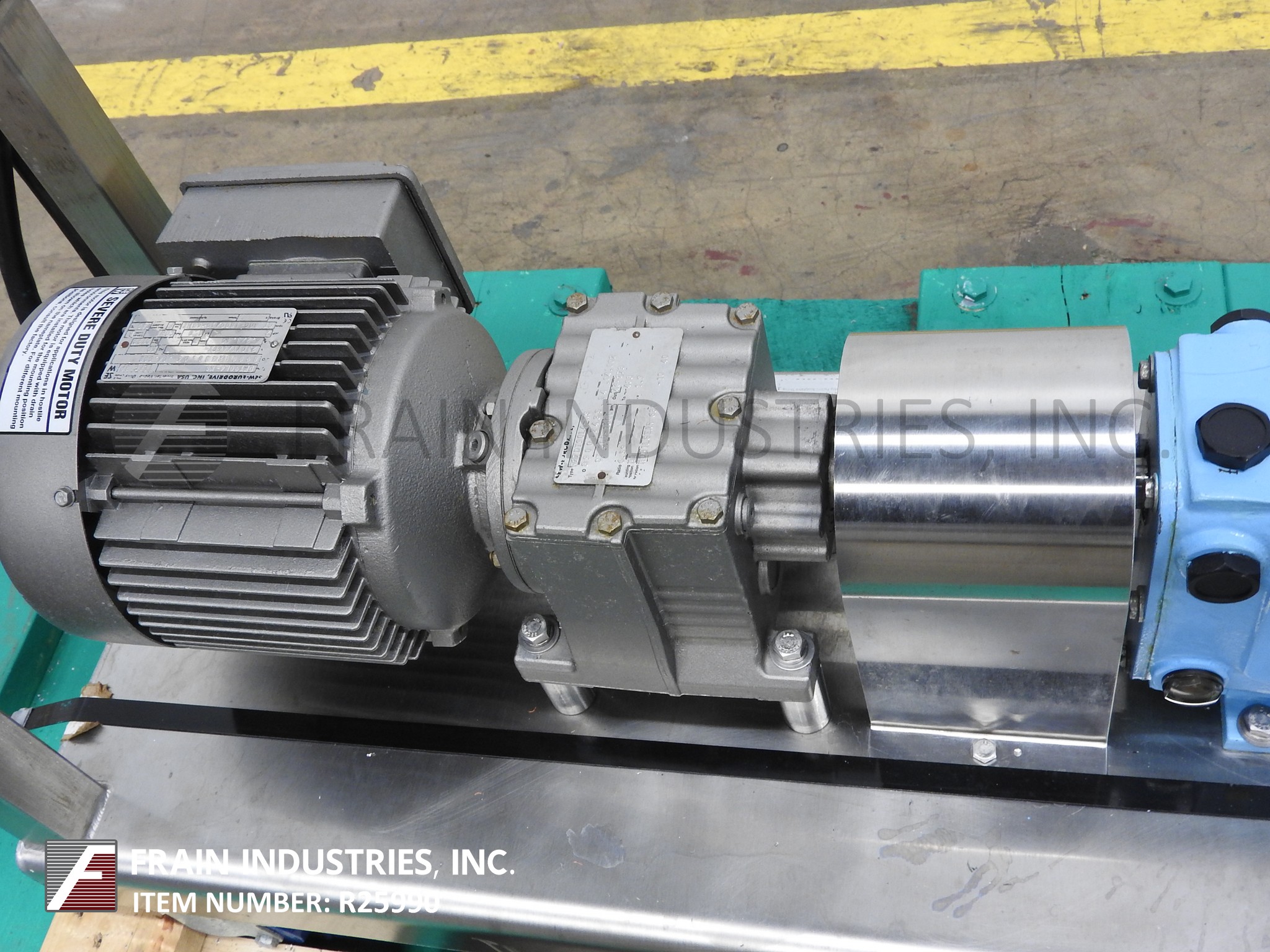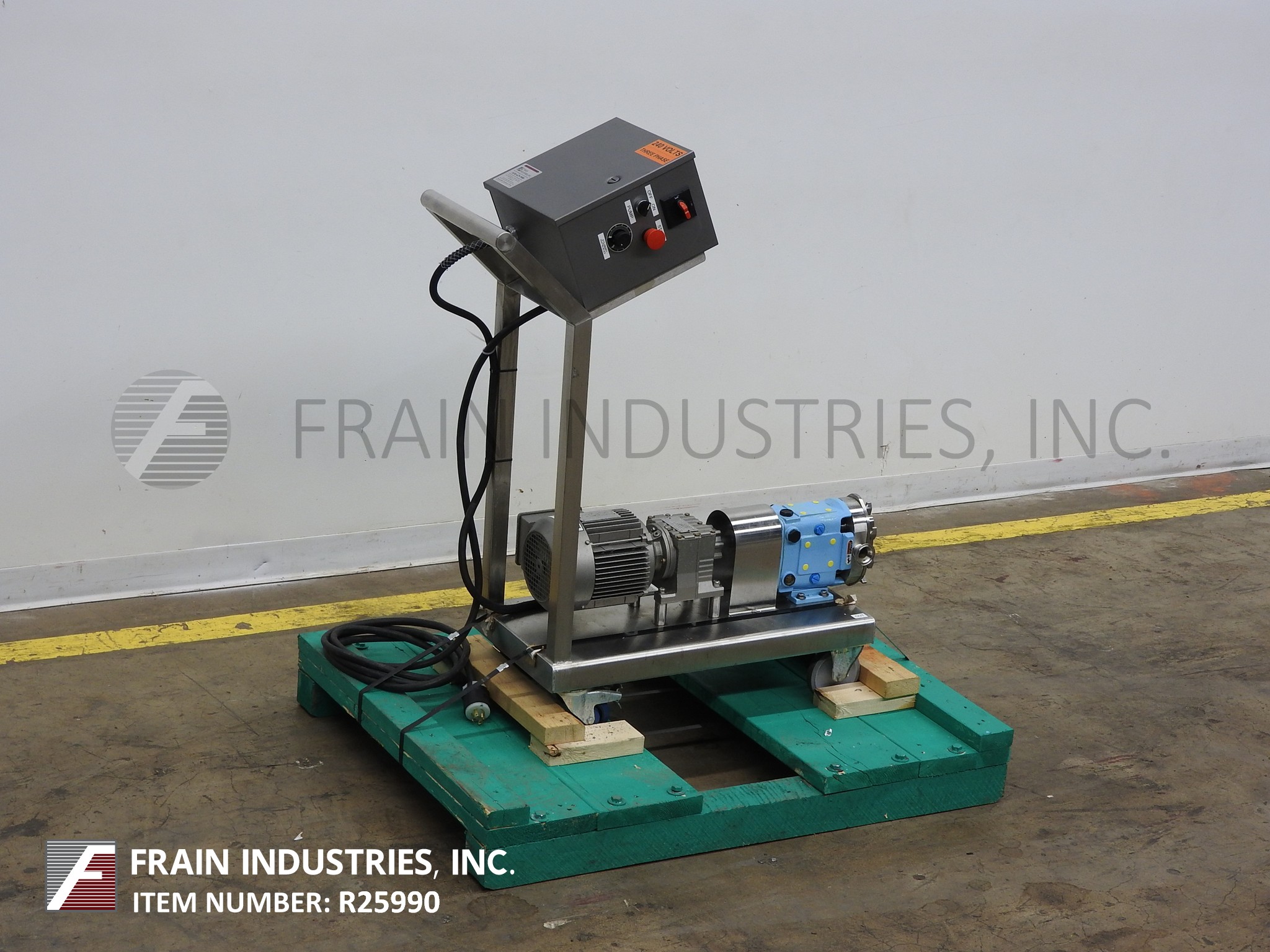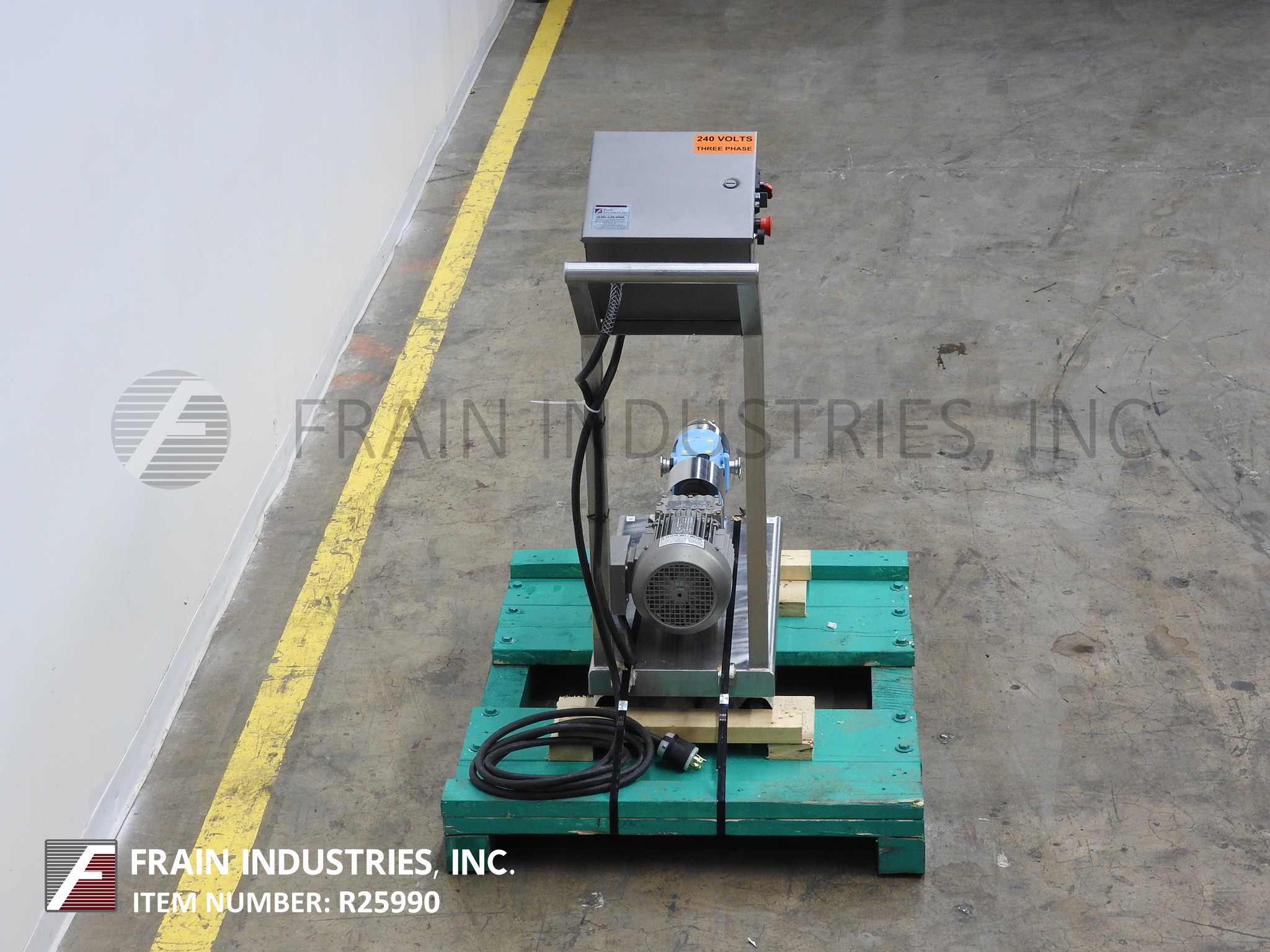Back to All EquipmentWaukesha, Model 15, positive displacement pump with 316 stainless steel contact parts. Rated from 1 to 10 gallons of product per minute – depending on materials, application and machine configuration. 200 psi maximum working pressure, temperature range of -40 Deg F to 200 deg f standard and up to 300 deg F with hot clearence rotors / stators and viton seals and capable operating both clockwise, or counter clockwise. Equipped with a 2" OD / 1½" ID Tri-clamp style product charge / discharge with 11" ground clearance. Powered by a 2 Hp drive with a variable speed controller and a 6.59:1 gear ratio for a maximum current rate of 3.54 gal/min. Mounted on a stainless steel push cart.