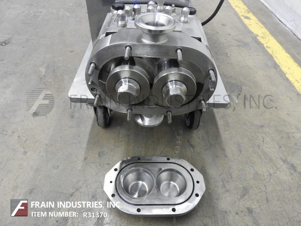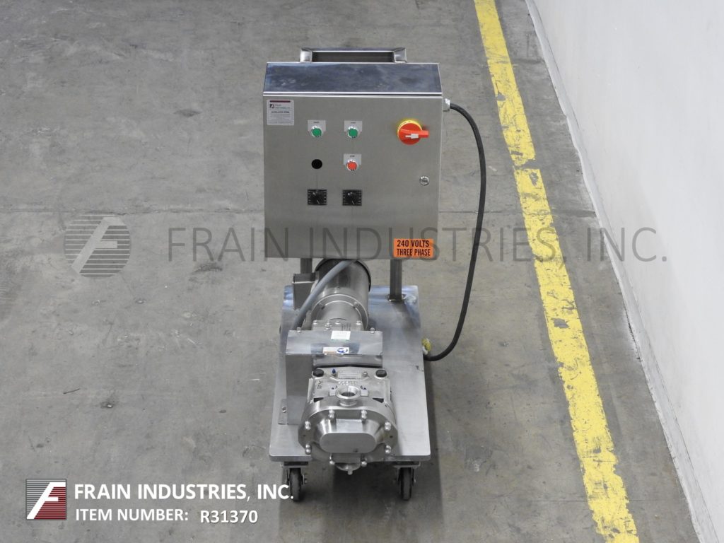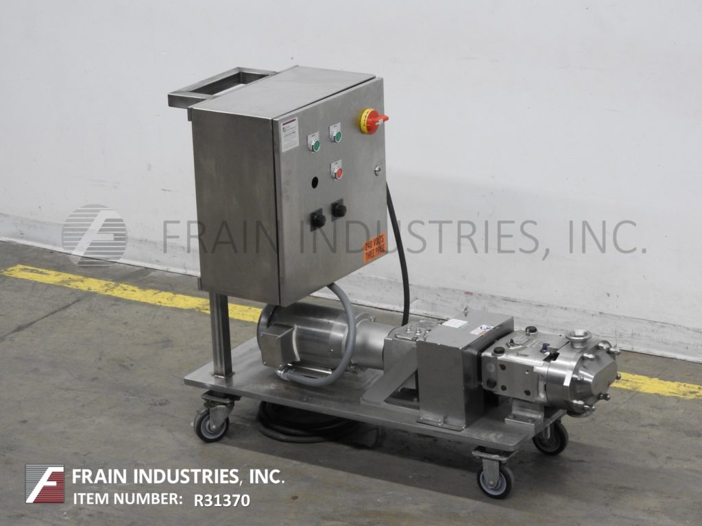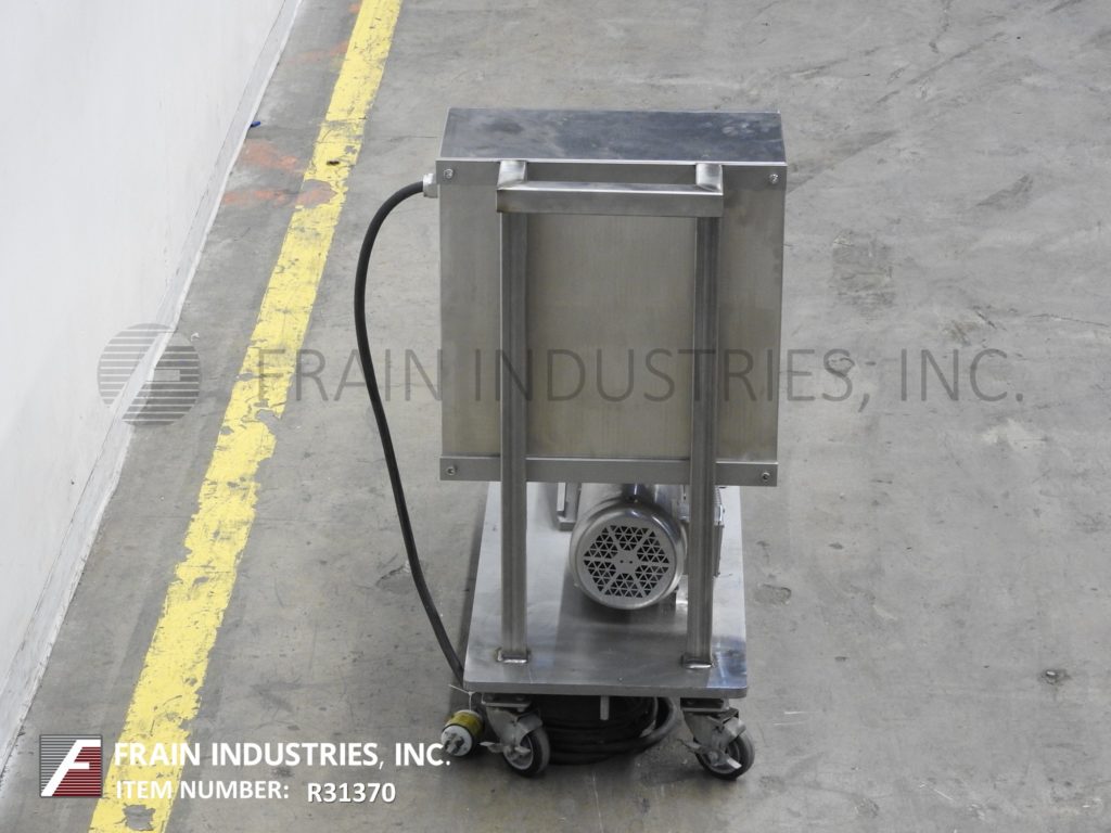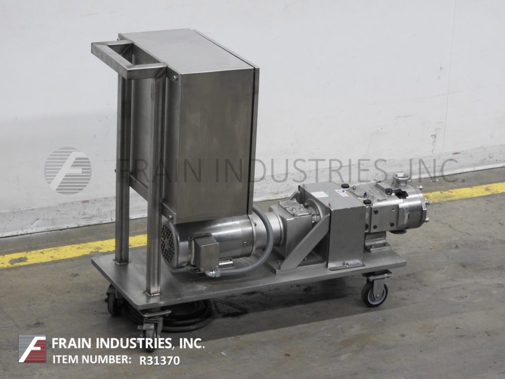 Back to All EquipmentWaukesha, Model 30, positive displacement pump 316 stainless steel contact parts. Equipped with 2½" OD / 2" ID Tri-clamp style product charge / discharge with 8" ground clearance. Powered by a 1 Hp motor drive with a variable speed controller and has 84.61:1 gear ratio for a maximum current rate of 1.24 gallons per minute. 200 psi maximum working pressure, temperature range of -40 Deg F to 200 Deg F standard and up to 300 Deg F with hot clearence rotors / stators and viton seals and is capable operating both clockwise or counter clockwise. Mounted on a 41" long x 17" wide stainless steel push cart.
