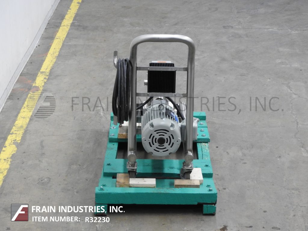 Back to All EquipmentWaukesha, Model 30, positive displacement pump with 316 stainless steel contact parts. Rated from 1 to 36 gallons of product per minute – depending on materials, application and machine configuration. 200 psi maximum working pressure, temperature range of -40 Deg F to 200 deg f standard and up to 300 deg F with hot clearence rotors / stators and viton seals and capable operating both clockwise, or counter clockwise. Equipped with 2" OD / 1½" ID Tri-Clamp style product charge / discharge with 15" ground clearance. Powered by 3 Hp motor drive with 4.93:1 gear ratio for a current rate of 21.42 gallons per minute. Control panel panel has touch pad variable speed control. Mounted on 46" long x 18" wide stainless steel (4) leg frame with casters.