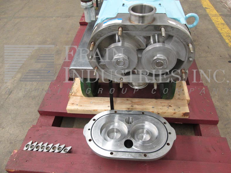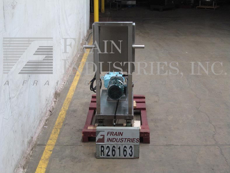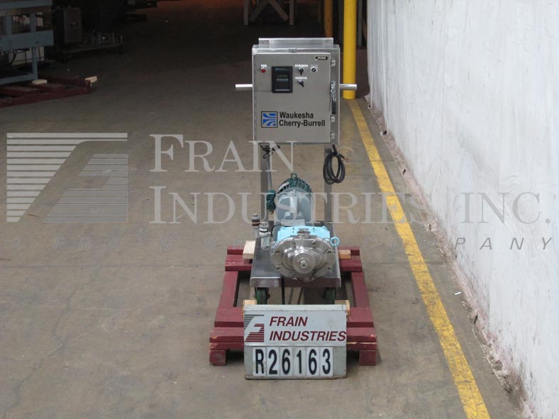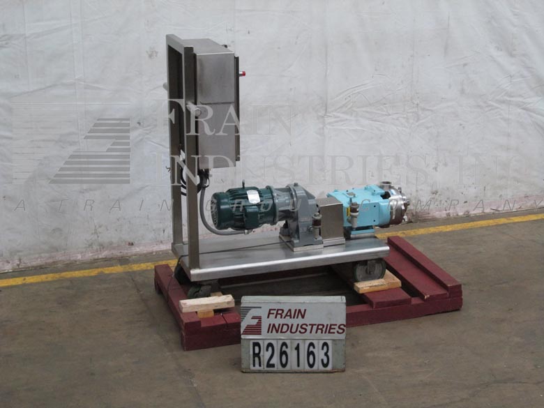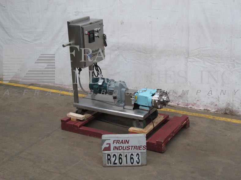 Back to All EquipmentWaukesha, Model 60, positive displacement pump with 316 stainless steel contact parts. Rated from 1 to 90 gallons of product per minute – depending on materials, application and machine configuration. 200 psi maximum working pressure, temperature range of -40 Deg F to 200 deg f standard and up to 300 deg F with hot clearence rotors / stators and viton seals and capable operating both clockwise, or counter clockwise. Equipped with an internal by pass pressure valve vented cover, 3" OD / 2½" ID Tri-clamp style product charge / discharge with 10" ground clearance. Powered by a 5 Hp drive with an AB variable speed controller and a 5:1 gear ratio for a maximum current rate of 53 gal/min. Mounted on a 48" long x 20" wide stainless steel push cart.