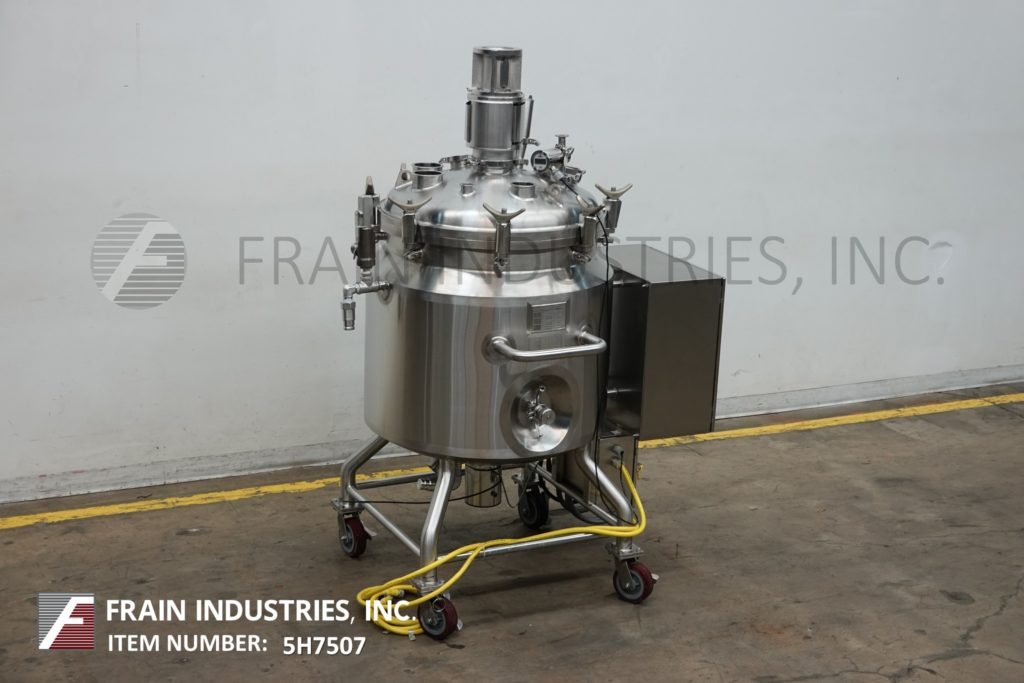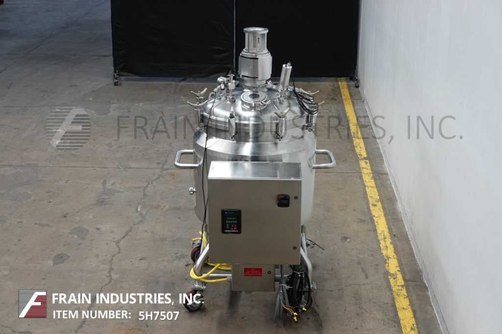 Back to All EquipmentW.H.E. Bio- Systems, 350 liter, 90 gallon capacity, 316 stainless steel jacketed processing tank. Vessel dimensions: 30" diameter x 30" straight wall. Equipped with bolt down dome cover, top mounted prop agitator. Dish bottom has 3" OD / 2½" ID center bottom discharge with 16" ground clearance. Control panel has a touch pad contoller with digital readout. Mounted on (4) legs with casters.