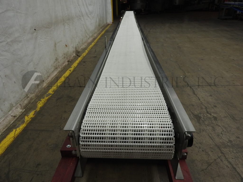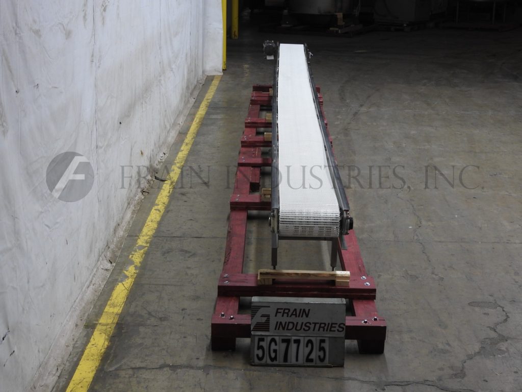 Back to All EquipmentWHM Equipment Co., 13¾" wide x 360" long stainless steel table top conveyor. 13¾" wide and 360" long Intralox style belt has an infeed / discharge range of 24" – 28". Equipped with a 1½ Hp drive and mounted on (10) legs.