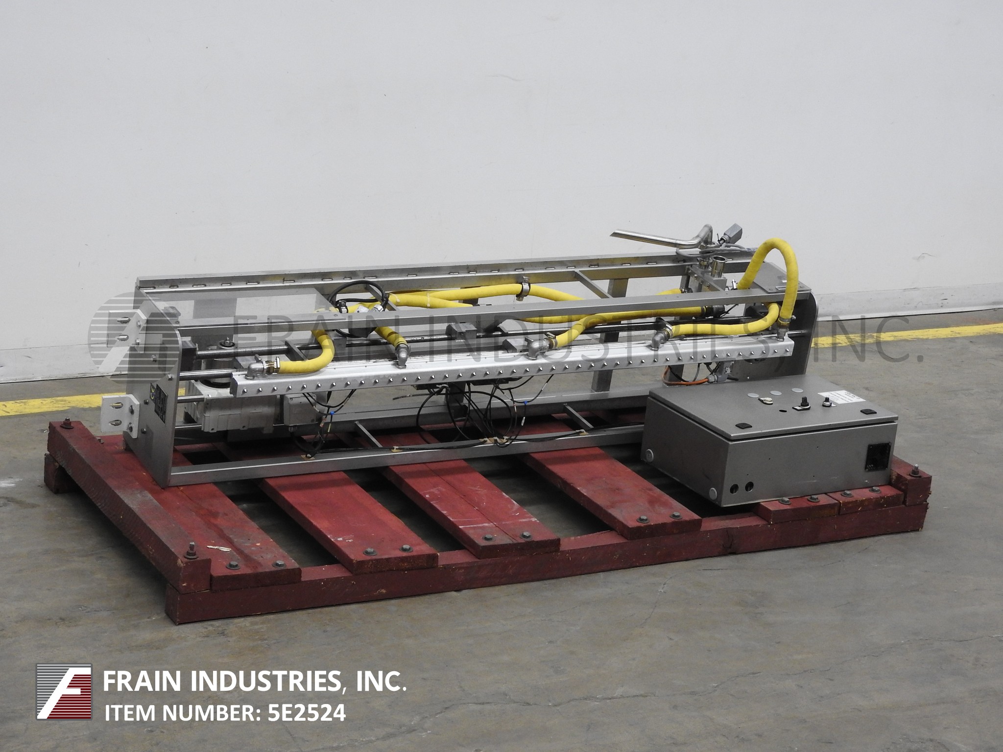 Back to All EquipmentWolf Model DECO DW 1800Z, 40 head 69" wide, pattern decorator set on 1-5/8" centers and is capable of doing up to 400 movements a minute and 99 different patterns with number of product – depending on materials and application. Equipped with electric heating on the receiving blocks and nozzle bank and control box. Mount above existing conveyor or intrigrated with an enrober.