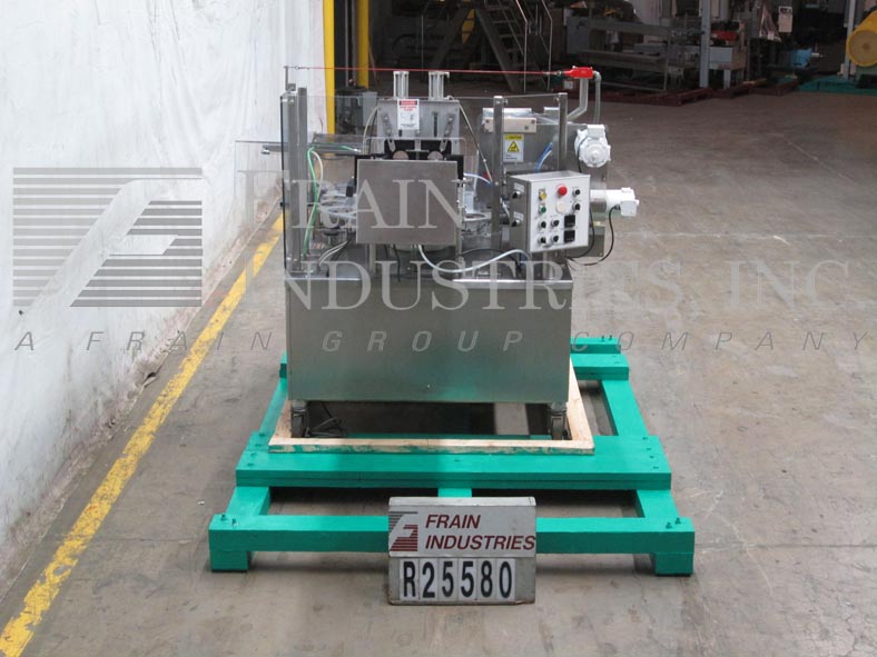 Back to All EquipmentWorld Cup Model 2 up, 16 pocket, rotary cup denester, filler, heat sealer and lidder, with number of cups per minute depending on materials and application. Stainless steel and anodized aluminum components. Container range: up to 4¾" OD. Equipped with 40" turn table, cup magazines, dual pistons, bottom-up fill, 3/4" OD positive cut off nozzles, film roll stock feeder and rewinder, heat sealing heads, 40" long roller lid magazines, lid applicator and sweep arm reject. Mounted on stainless steel frame with locking casters.